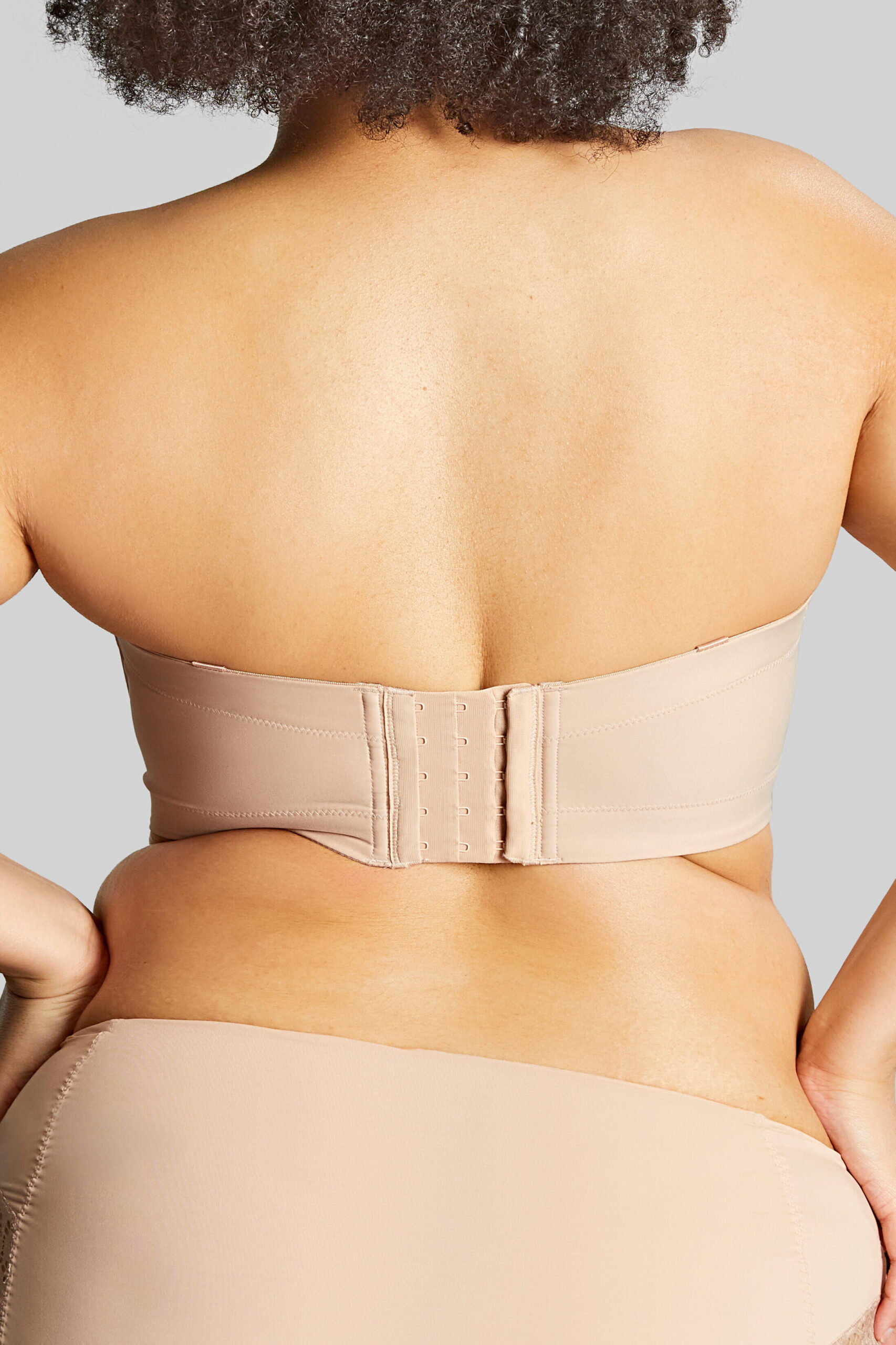 When fitting the band of a strapless bra ensure that it is firm and done up on the loosest hooks as usual. It is recommended, if the outfit allows, that you position the band a couple inches higher on the customer’s back than they would usually wear their bra. It is best to start with the bra band sitting high under the customer’s arms and do the hooks and eyes up while in this higher position, instead of doing it up low and trying to lift the band up – which can feel very uncomfortable and is less effective. This can feel strange at first but they should find that this gives them increased lift in the cup and more stability when wearing the bra, as the bra is positioned on the latissimus dorsi muscles and not encouraged to roll down into the customer’s waist. This is ideal, however at the end of the day the customer needs to find the most comfortable and outfit appropriate positioning for their strapless bra.