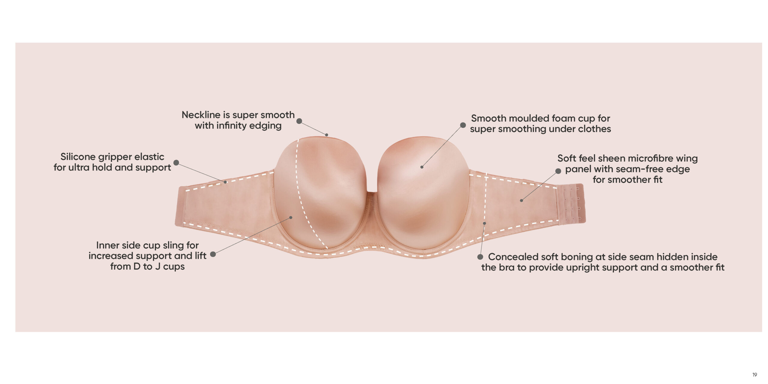 Side Boning – this can help stabilise the side of the band and prevent rolling. Customers will either like or dislike this feature depending on how it works with the shape of their body. Encourage your customer to move around and sit down on the seat in the fitting room while trying on each strapless bra to fully test each style and avoid disappointment later on.