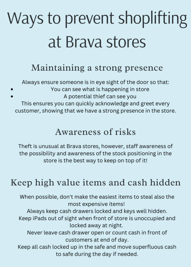 Ways to Prevent Shoplifting at Brava Shoplifting Prevention Ways to Prevent Shoplifting at Brava Previous Lesson Back to Course Next Quiz
